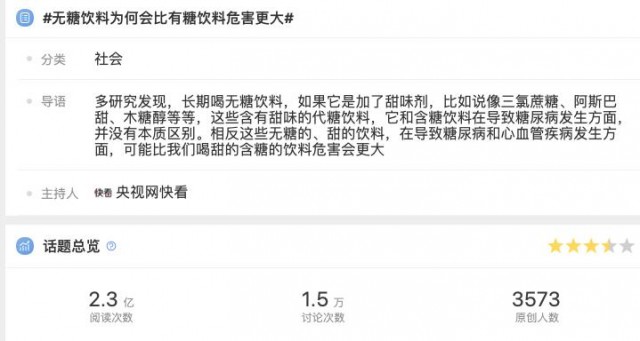 该视频一经发布后,关于“无糖饮料为何会比有糖饮料危害更大”的话题很快登上了热搜,阅读次数超2亿,讨论次数达1。5万,可见网友对无糖饮料的关注。尤其是在主任医生的发声下,更给了无糖饮料反对者底气,在讨论中可以看到对无糖饮料的各种抨击。