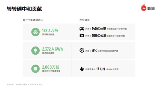 从二手循环流转行业本身看,欧美国家很多产业都已推进,中国则处于刚起步阶段,很多人觉得买卖二手太麻烦导致闲置资源没有充分的流转和再利用。因此,转转一直努力在行业里去建立一种全新的体验:为消费者提供更靠谱、更省心的服务。过去6年多的时间里,转转携手广大用户通过交易上亿件闲置物品,就已实现超过180万吨的碳减排量;平台累计减少能源消耗2372。4GWh,相当于节约了2019年北京市6%的发电量;此外,平台累计销售的2000万册图书相当于保护了17万棵树木资源。
