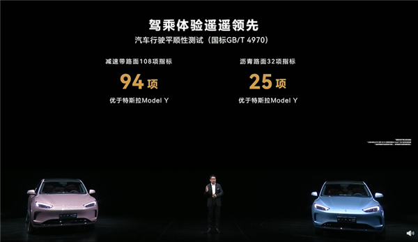 同时他还表示,目前全世界也就特斯和华为掌握了该技术,不过AITO问界M5 EV的驾乘体验“遥遥领先”,其中减速带路面108项指标里,有94项优于特斯拉Model Y,沥青路面32项指标25优于特斯拉Model Y。