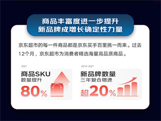 数据显示,2021年,京东超市实现销售额50%以上增长的细分品类近800个;截至2021年,连续三年实现销售额年复合同比增长超50%的细分品类超700个。一年内,京东超市年销售额超10亿元的品牌超50个,同比增长30%,超1亿元的品牌近500个,同比增长35%。