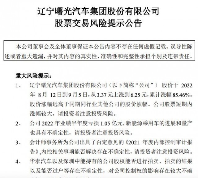 公告内容显示,公司主营汽车整车及零部件生产及销售,公司生产经营正常。公司董事、监事和高级管理人员正常履行职责。公司股票于2022年8月12日到9月5日,公司股价从3。37元上涨到6。25元,累计涨幅85。46%。不存在其他应披露而未披露的重大信息,包括但不限于重大资产重组、发行股份、上市公司收购、债务重组、业务重组、资产剥离和资产注入等重大事项。