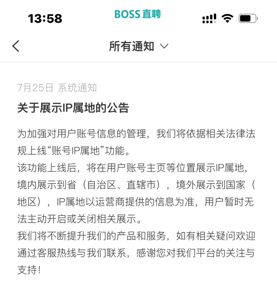 7 月 26 日消息,BOSS 直聘 7 月 25 日发布系统通知,宣布将上线展示 IP 属地。