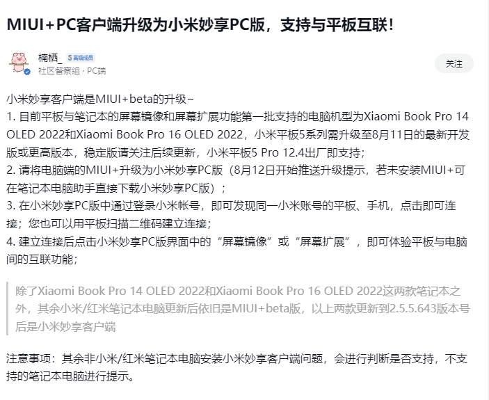 小米透露,平板和电脑跨屏协作功能第一批支持的平板机型为小米平板 5 Pro 12。4,电脑机型为 Xiaomi Book Pro 14 OLED 2022、Xiaomi Book Pro 16 OLED 2022,而且用户还需要将电脑端的“MIUI+”应用升级为“小米妙享 PC 版”才可以使用。