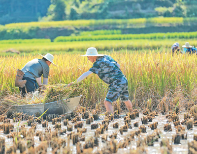 在贵州省从江县刚边壮族乡,水稻进入成熟期,当地组织党员干部走进田间地头,帮助农户抢收水稻,确保粮食颗粒归仓。图为9月2日,在刚边壮族乡三联村,党员帮助群众收稻。