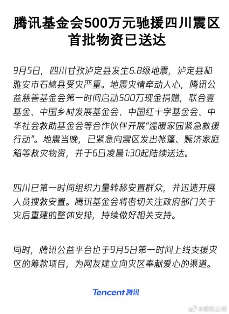 腾讯公司称,灾情牵动人心,腾讯公益慈善基金会第一时间启动 500 万现金捐赠,联合壹基金、中国乡村发展基金会、中国红十字基金会、中华社会救助基金会等合作伙伴开展 “温暖家园紧急救援行动 。当晚,已紧急向震区发出帐篷、赈济家庭箱等救灾物资,并于 6 日凌晨 1!30 起陆续送达。腾讯基金会将密切关注部门关于灾后重建的整体安排,持续做好相关支持。同时,腾讯公益平台也于 9 月 5 日第一时间上线支援灾区的筹款项目,为网友建立向灾区奉献爱心的渠道。
