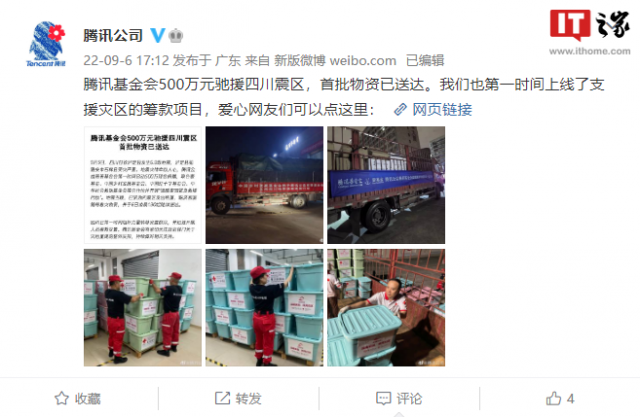 9 月 6 日消息,据腾讯公司官微消息,腾讯基金会 500 万元驰援四川震区,首批物资已送达。