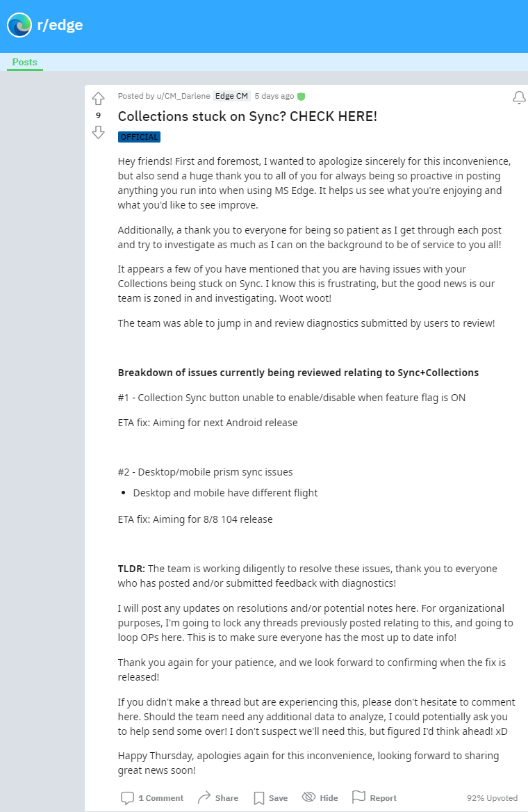 微软已经意识到这些问题,并且很快就会提供所需的错误 Bug 修复。根据 Reddit 上的 Edge 社区经理的说法,微软将在下一个 Android 版本中修复损坏的“集锦”同步按钮。其他问题,例如未出现在其他设备上的“集锦”更改,预计会在 Edge 104 中修复,该版本将于 8 月初推出。