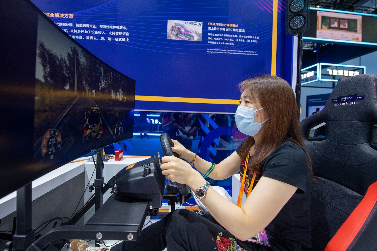 在国家会议中心综合展区的亚马逊云科技展台,参观者正在体验模拟赛车带来的乐趣。人民网记者 翁奇羽摄