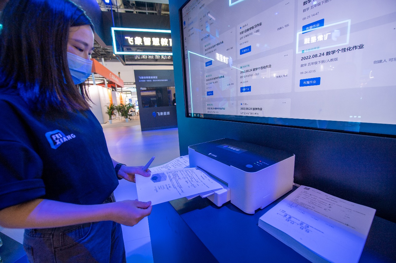在国家会议中心综合展区的飞象星球展台,工作人员正在操作展示智能批改系统。人民网记者 翁奇羽摄