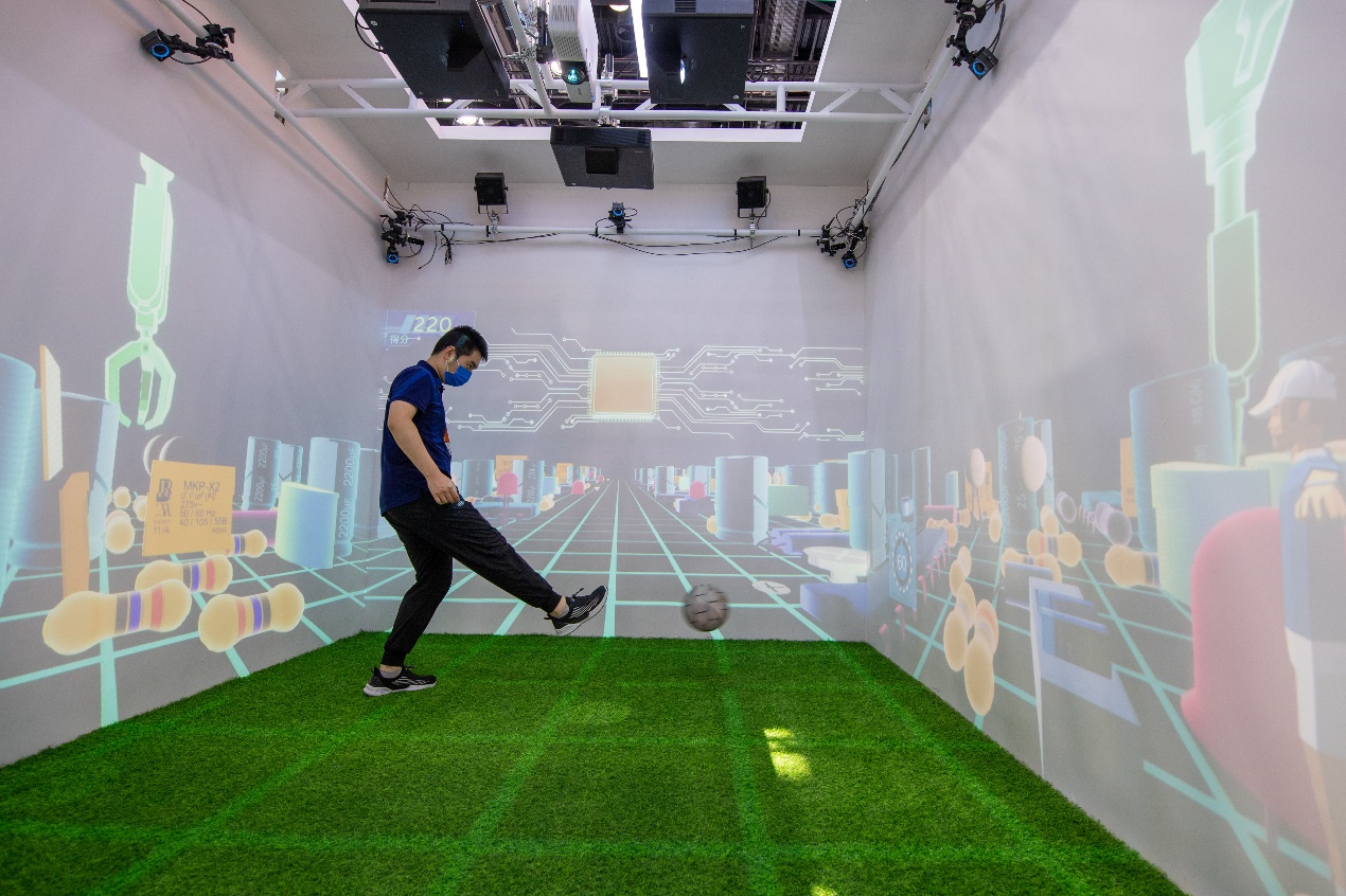 在国家会议中心综合展区的高通展台,参观者通过工体元宇宙GTVerse,沉浸式体验足球带来的乐趣。人民网记者 翁奇羽摄