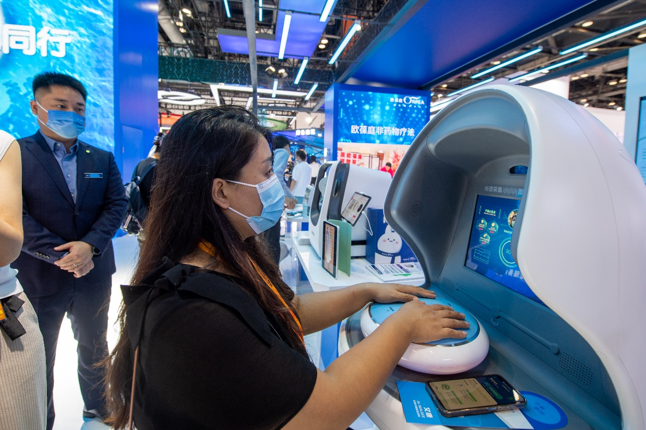 在国家会议中心综合展区的太平洋保险展台,参观者正在进行免疫力检测。人民网记者 翁奇羽摄