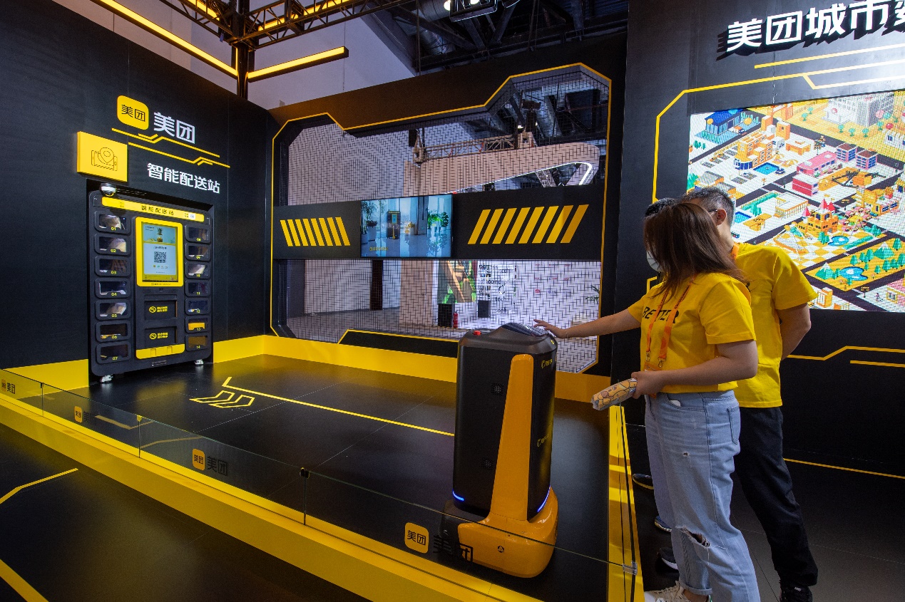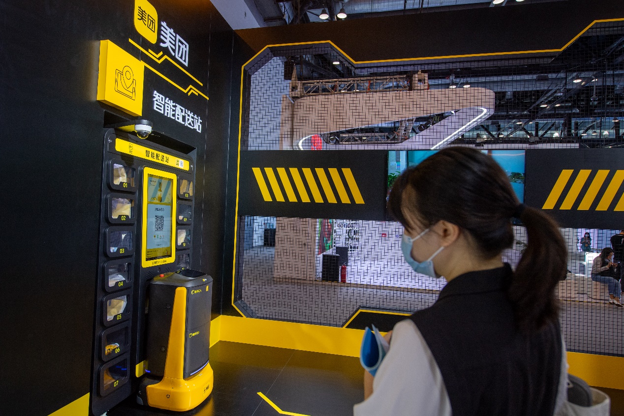 在国家会议中心综合展区,工作人员正在展示智能配送。人民网记者 翁奇羽摄