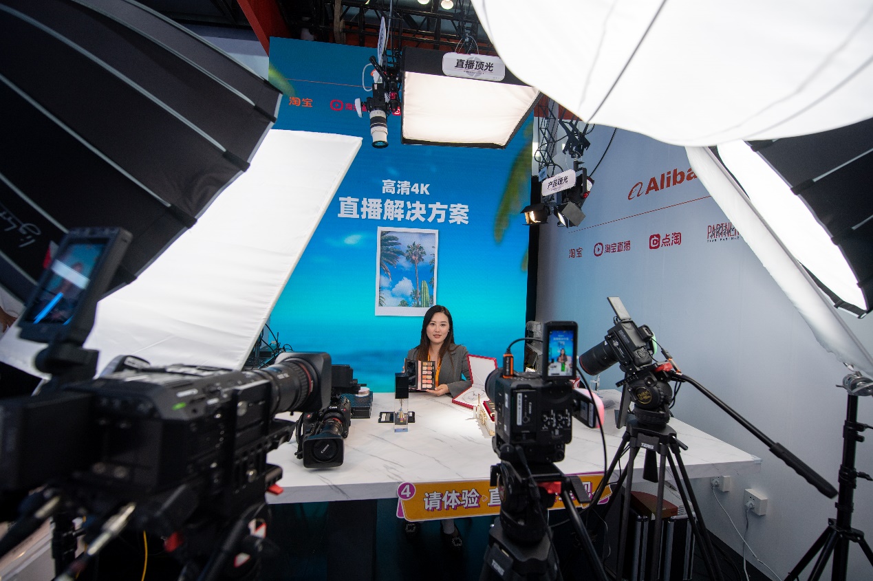 在国家会议中心综合展区的阿里展台,参观者现场体验高清4K直播。人民网记者 翁奇羽摄