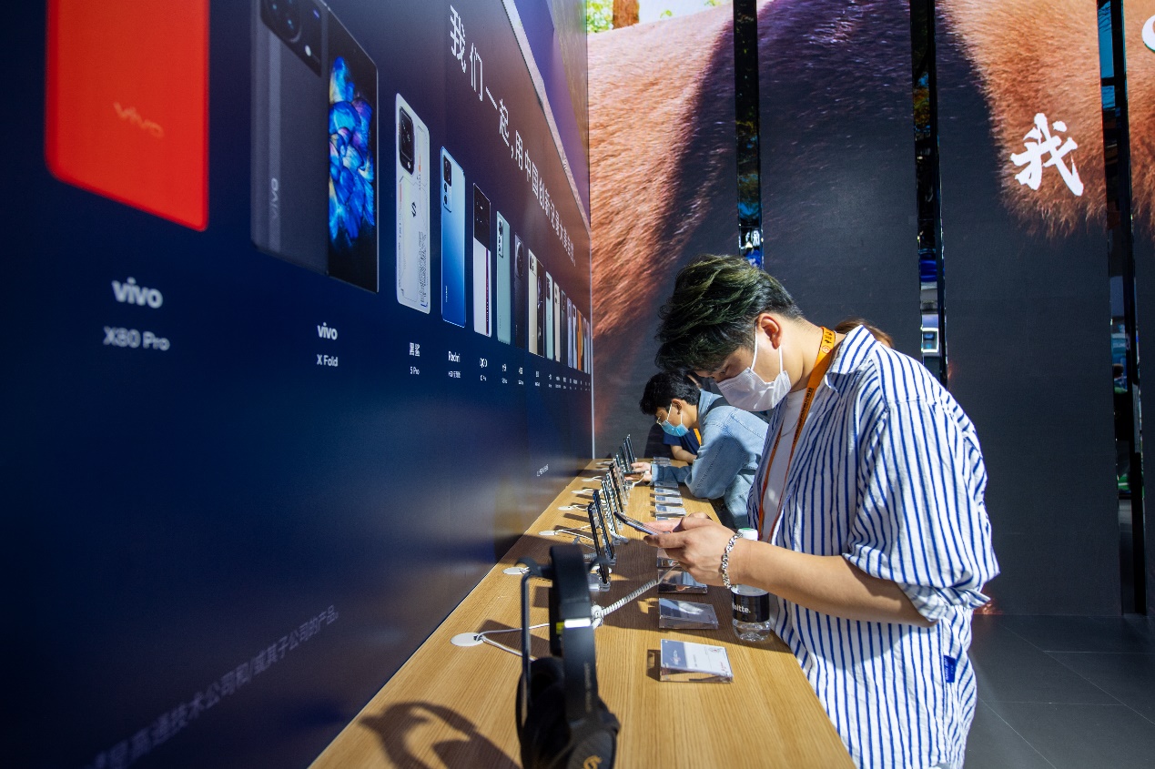 参观者正在体验新款5G手机。人民网记者 翁奇羽摄