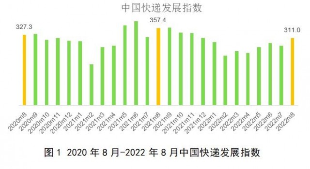 9月6日消息,据国家邮政局消息,经测算,2022年8月中国快递发展指数为311,环比提高12。9%。其中,发展规模指数和发展能力指数分别为362。6和200。8,同比分别提高4。7%和6。2%;服务质量指数和发展趋势指数分别为450。8和67。6,环比分别提高33。9%和下降1。8%。行业整体运行平稳,恢复势头良好。