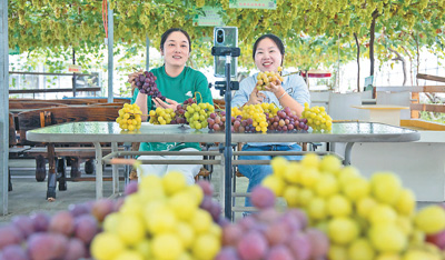 近年来,江苏省句容市大力发展葡萄种植等特色产业,建立专业合作社,引导农户统一生产标准,并探索利用网络直播等形式拓宽销售渠道,确保增产增收。图为9月3日,在句容市茅山镇丁庄葡萄分拣中心,种植户在直播带货。