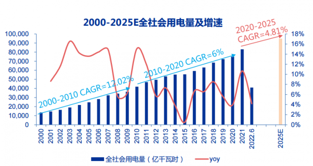 图3:2000-2025E全社会用电量及增速