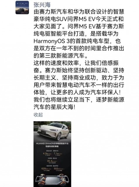 赛力斯集团董事长(创始人)张兴海在在社交媒体表示,“问界M5EV基于赛力斯纯电驱智能平台打造,是搭载华为HarmonyOS3的首款纯电车型,也是双方在一年不到的时间里合作推出的第三款新能源汽车。这样的速度和效率,让我们倍感振奋。”